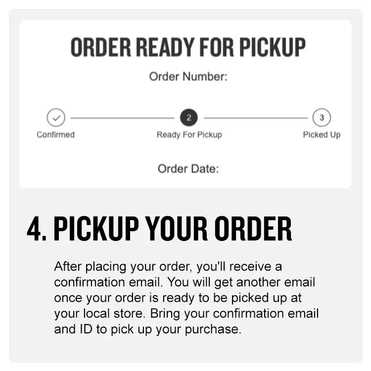 Pick up your order: After placing your order, you'll receive a confirmation email. You will receive another email once your order is ready for pickup at your local store. Bring the confirmation email and your ID to pick up your purchase.